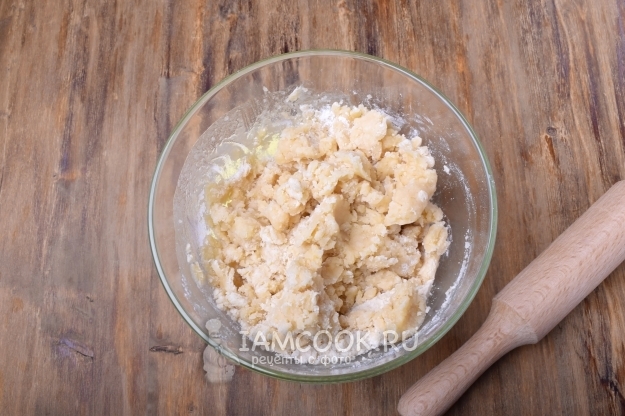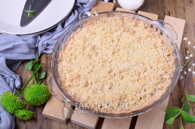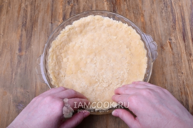 Структура теста не позволяет раскатать его скалкой, поэтому формировать пирог будем руками. И не важно, что верх пирога не украсит симпатичная решетка или затейливые цветы - румяные и хрустящие крошки выглядят тоже весьма аппетитно!