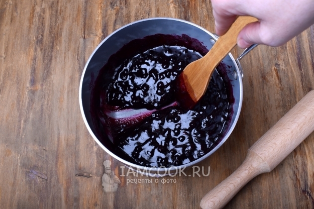 Все перемешаем. Масса станет мутной и жидкой. Прибавим огонь и при слабом кипении и постоянном помешивании, будем варить начинку до загустения (около 5 минут). Готовая начинка станет глянцевой и в меру густой.