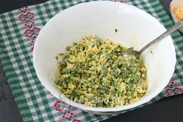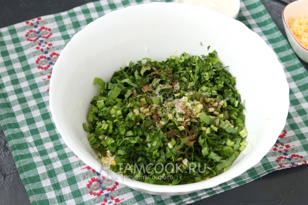 Черемшу тщательно промыть и обсушить. Затем мелко нарезать. Также измельчить петрушку. Добавить зелень к яйцам с сыром, посолить и поперчить.