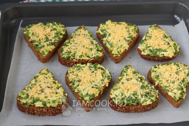 Намазать полученной массой хлеб и разложить на противень, застеленный пергаментом.