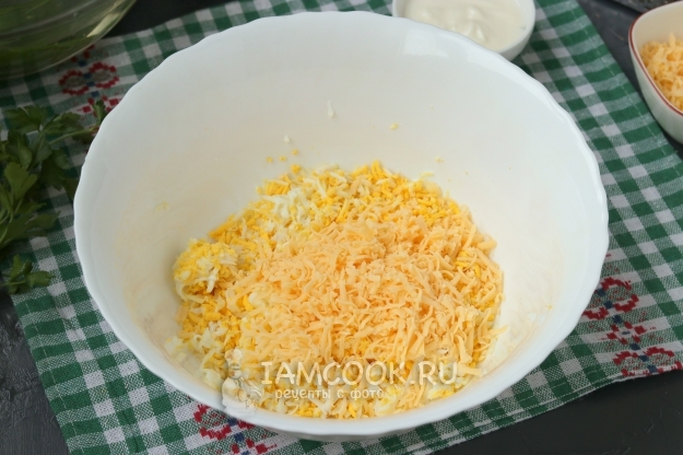 Сварить куриные яйца, остудить и почистить. Натереть яйца на мелкой тёрке, добавить к ним половину натёртого сыра.
