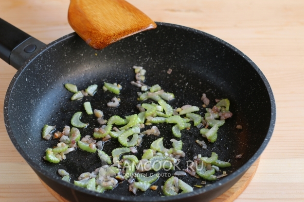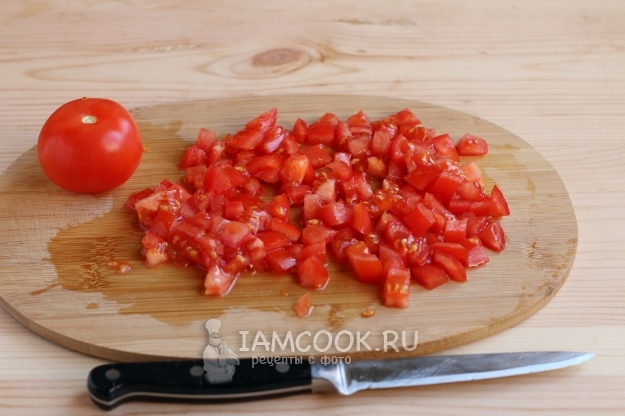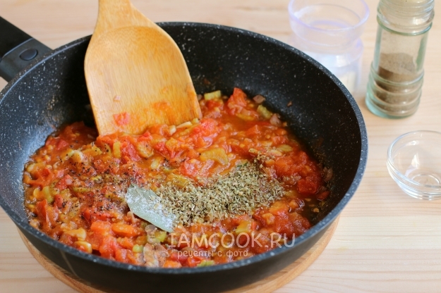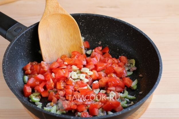 Когда овощи станут прозрачными, добавим в сковороду помидоры и чеснок. Сок с помидоров сливать не будем, он нужен в блюде. Продолжим обжаривание на маленьком огне, постоянно помешивая.