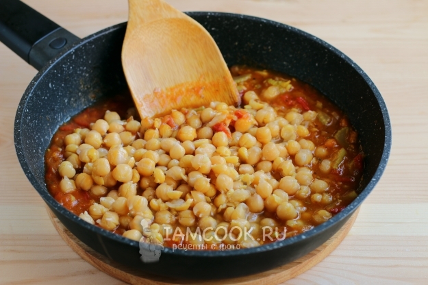 Через пять минут добавим в сковороду нут, уберем лавровый лист и перемешаем, закроем крышкой и будем тушить на малом огне минут 30, подливая по мере необходимости воду, в которой варился нут, регулируя густоту соуса по своему вкусу.