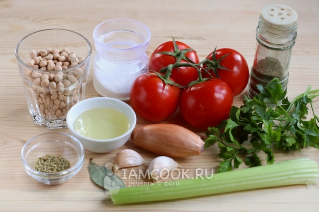 Итак, предлагаю приготовить тушеный нут в томатном соусе, блюдо сытное и очень вкусное. В моем домашнем меню оно занимает не последнее место. Возьмем необходимые по списку продукты.