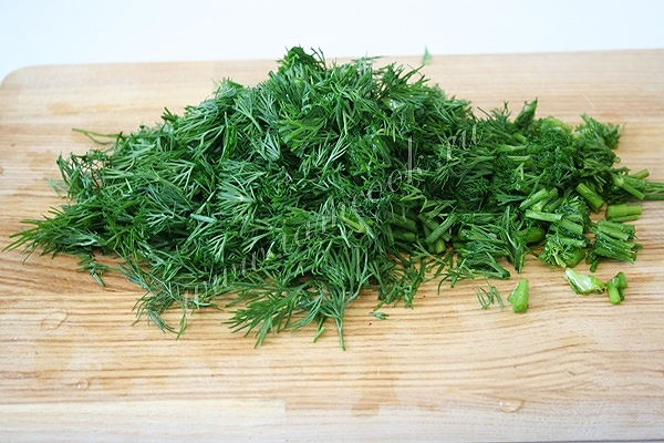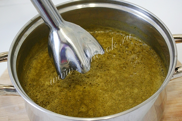 В кастрюлю налить примерно половину воды, довести до кипения. Бросить в кипящую воду щавель и половину укропа. Варить 2-3 минуты. Выключить и остудить. Остывший отвар пюрировать при помощи блендера.