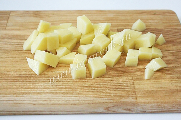 Картофель очистить. Нарезать небольшими кубиками и отварить в оставшейся воде до готовности.