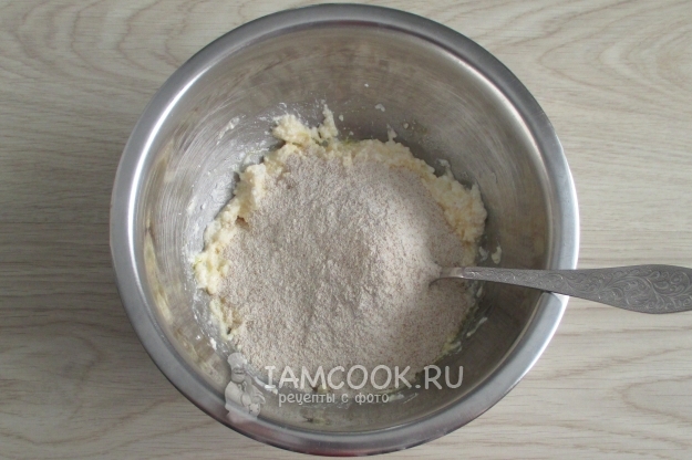 Добавьте порцию муки, в которую по желанию вмешайте соль, сахар и разрыхлитель или соду.