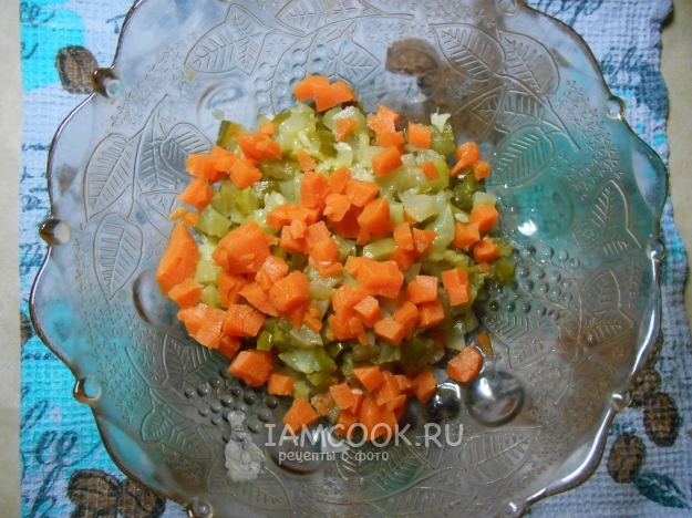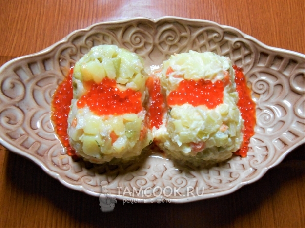 Нужно помнить, что калорийность в рецепте дана без заправки. 100 г постного майонеза прибавит от 520 ккал, а 100 г заправки - от 752 ккал.