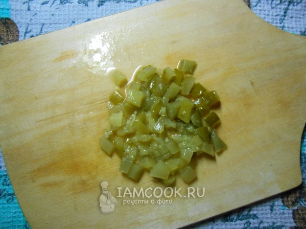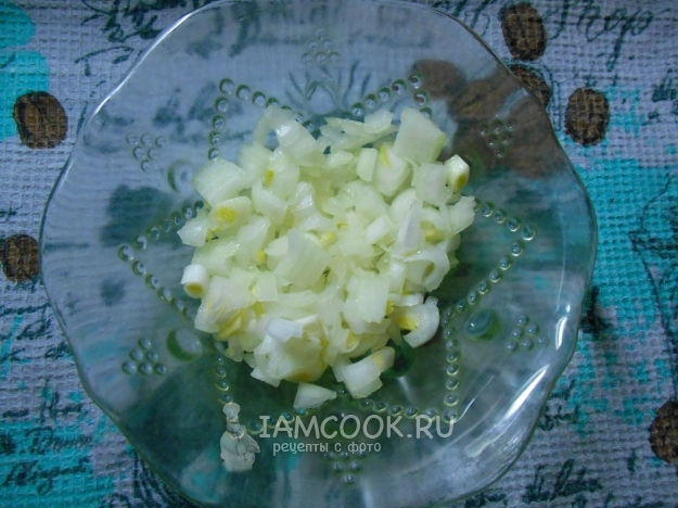 Нашинкуем лук средним кубиком, ошпарим его кипятком.