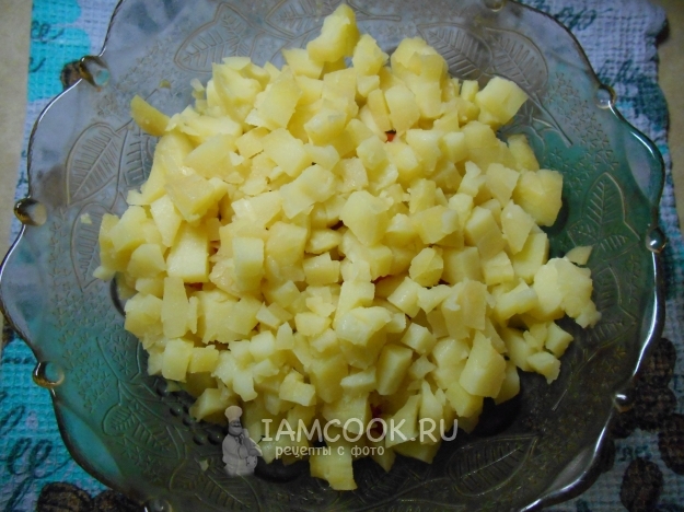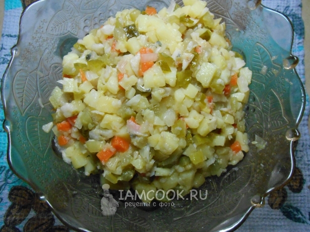 Разберём рыбу на филе, удалим косточки. Положим в салатник. Всё хорошо перемешаем. В присаливании салат не нуждается.