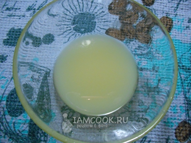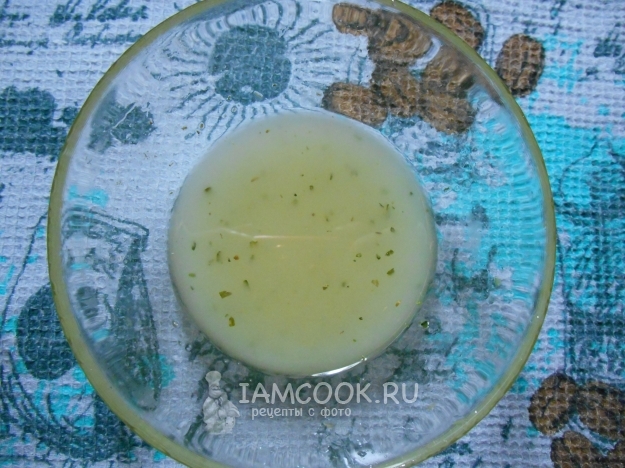 Займёмся приготовлением заправки, поскольку ей необходимо настояться в холодильнике. Берём растительное масло, вливаем лимонный сок и взбиваем венчиком. Смесь должна стать мутной и приобрести слегка серый оттенок.