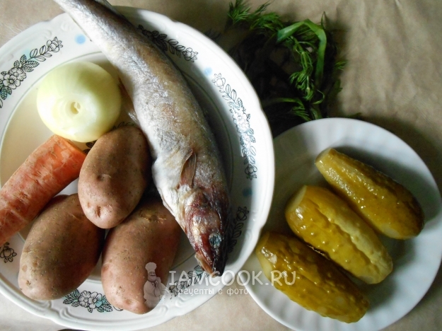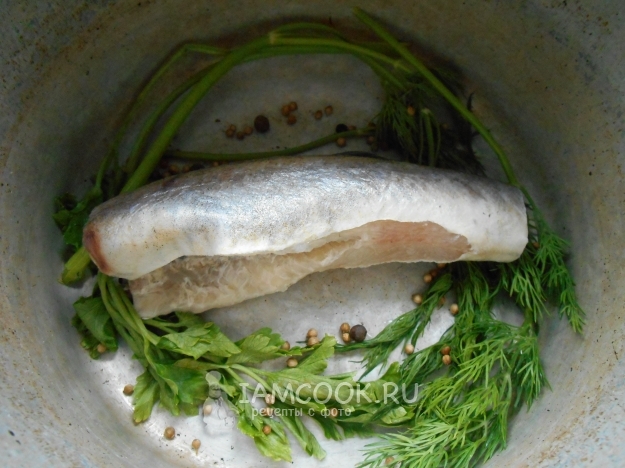 Ставим вариться овощи привычным для Вас способом. Рыбу нужно выпотрошить, удалить голову и хвост, хорошо промыть. На дно кастрюли положим веточки укропа, петрушки и душистый перец, кориандр. Воду нужно наливать, только чтобы покрыть рыбу, и немного посолить. Варим до готовности рыбу и овощи. Затем охлаждаем до комнатной температуры.