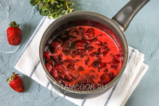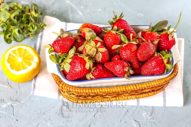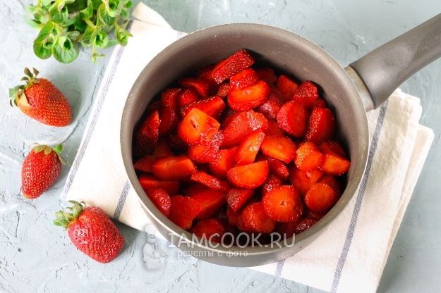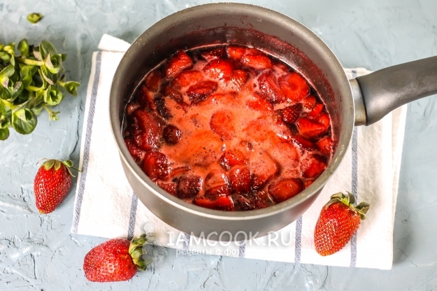 Пересыпьте всю нарезанную клубничную массу в казан или ковш с антипригарным дном, небольшую кастрюлю. Влейте лимонный сок или всыпьте пару щепоток лимонной кислоты.