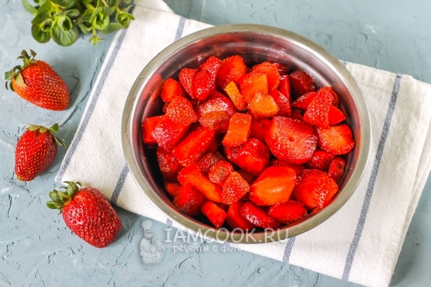 Клубнику промойте в воде, оборвите с ягод хвостики и нарежьте средними кусочками в миску или салатник.