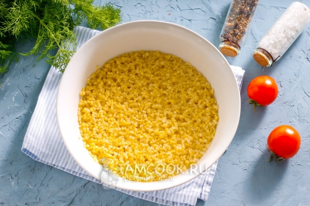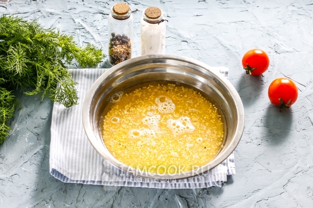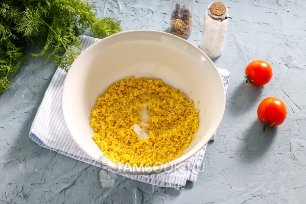 Высыпьте промытую крупу в глубокую емкость без серебристых или золотистых рисунков. Всыпьте соль.