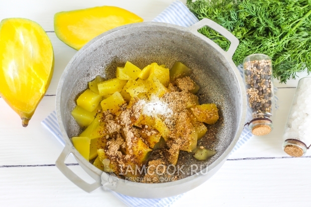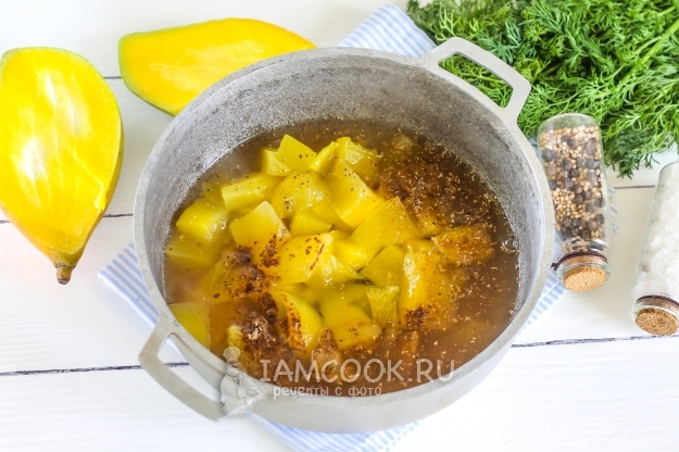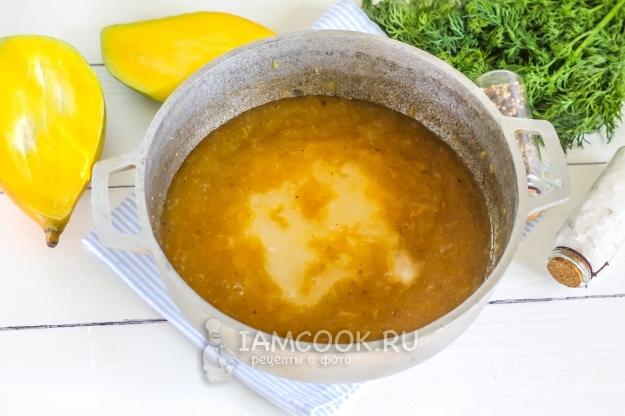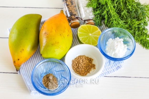 Манго разрежьте пополам, срежьте косточку и очистите кожуру. Промойте в воде и нарежьте средними кубиками. Если плод крупный - хватит одного фрукта, если мелкий, то используйте два или три. Всыпьте нарезку в казан или ковш с антипригарным дном. Добавьте туда же все остальные приправы и специи. Влейте сок лайма.