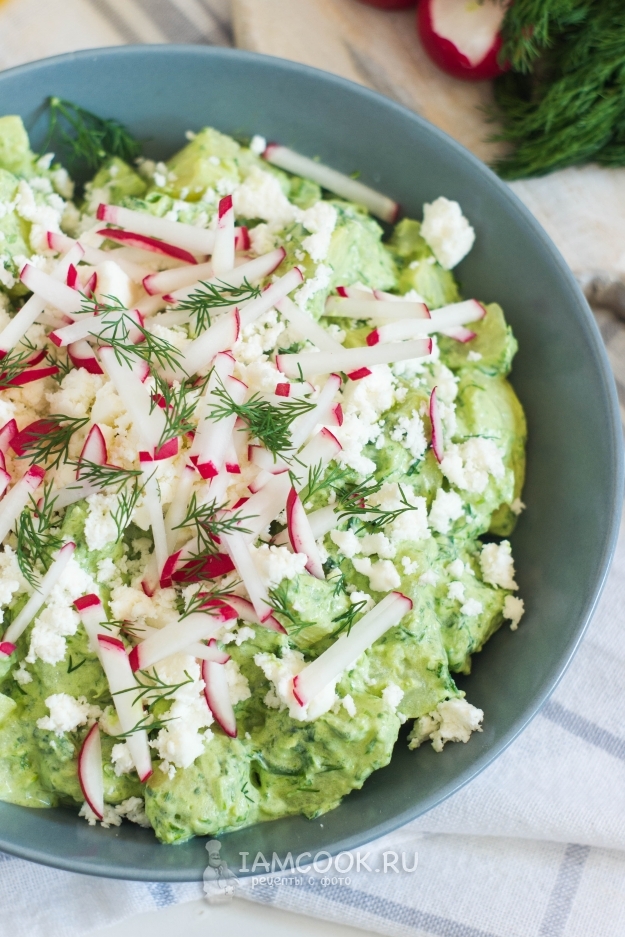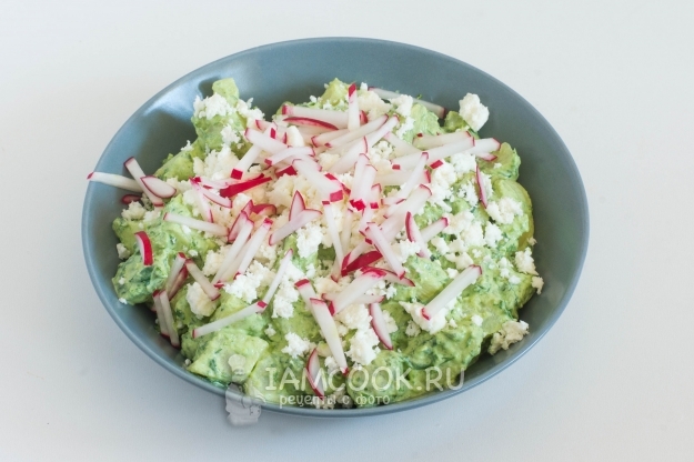 Выложите в тарелку или салатник и посыпьте раскрошенным адыгейским сыром. Сверху добавьте редис, нарезанный соломкой.