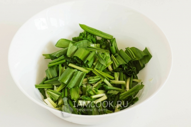 Черемшу тщательно промойте. Для этого сразу, пока черемша еще в виде неразобранного пучка, срежьте кончики, развяжите пучок и в большой миске, наполненной водой, тщательно промойте зелень. Сполосните черемшу под проточной струей воды и дайте немного высохнуть. Можно промокнуть полотенцем. Крупно нарежьте чистую черемшу.
