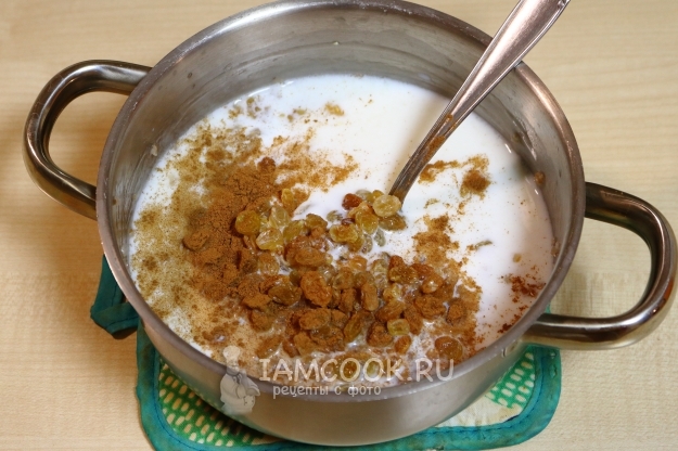 Добавляем к готовой пшеничке молоко, разбухший изюм, корицу. Продолжаем варку, помешивая, на небольшом огне до желаемой консистенции каши (5-10 минут).