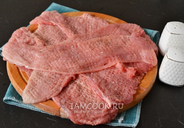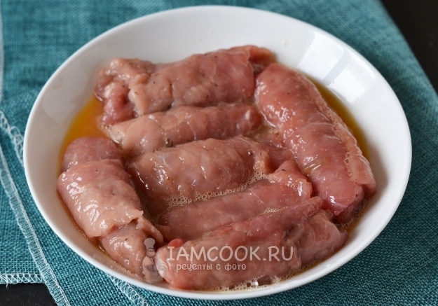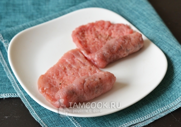 Свинину порежем удлиненными прямоугольниками. Отобьем до состояния широких лент. Приправим солью и перцем - по 2 щепотки соли и 1 щепотке перца на каждую сторону.