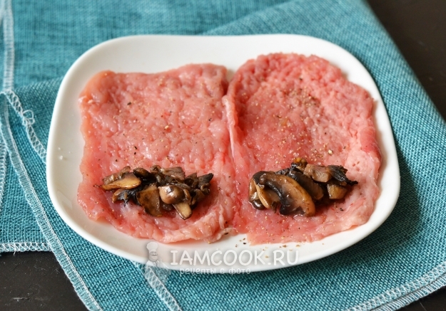 Ленты делим на две части. Выкладываем у основания грибную начинку.