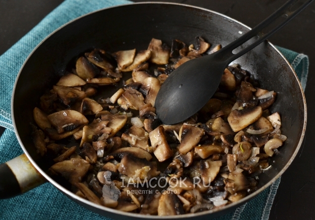 Для начала приготовим начинку для пальчиков. Шампиньоны порежем пластиночками. Обжарим на масле с добавлением репчатого лука и измельченного чеснока. В процессе жарки посолим слегка. Время приготовления начинки - не более 7 минут. Грибы не должны стать сухими.