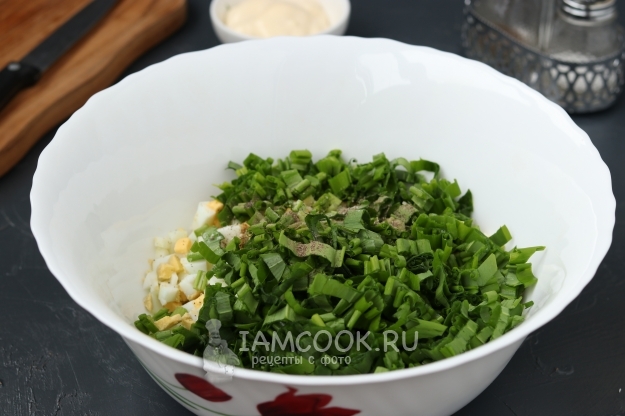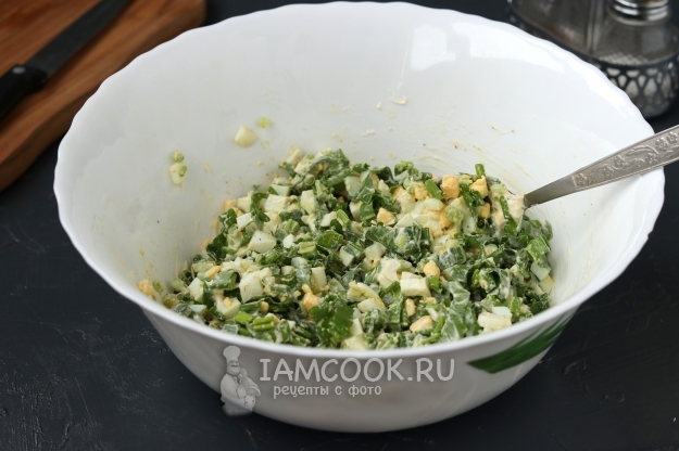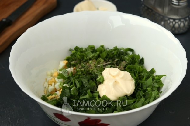 Поместите салат из черемши с майонезом в небольшой салатник и подавайте к столу.