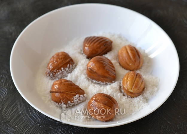 Часть сгущенного молока нужно развести кипяченой водой. Должна получиться полужидкая масса. Наносим тонкий слой жидкой сгущенки на всю поверхность наших орешков, грибочков и ракушек. Окунаем печенье в кокосовую стружку.