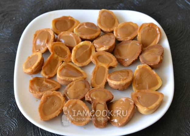 Наполняем половинки вареной сгущенкой. Кстати, сгущенку я сварила самостоятельно за 3 часа прямо в банке.