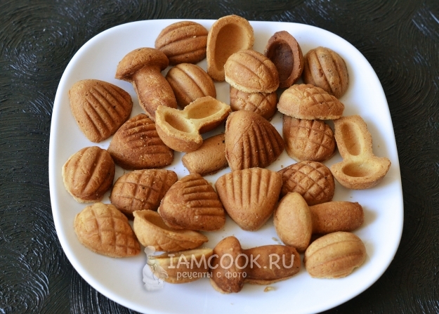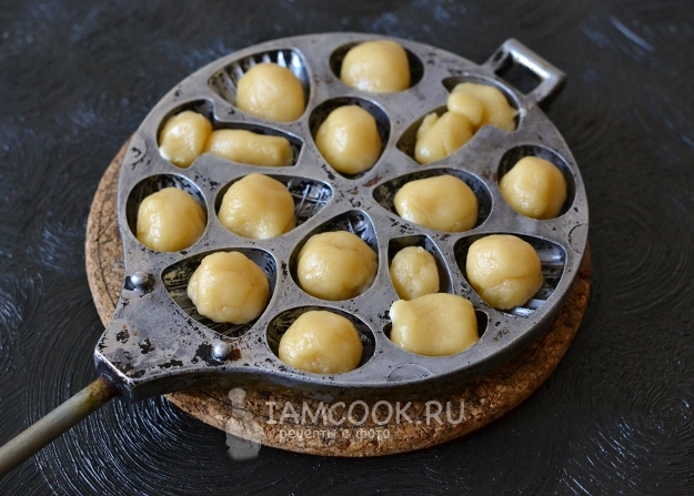 Берем форму для выпечки орешков. Хорошо разогреваем на плите. Смазываем растительным маслом две стороны орешницы. Тесто скатываем в мини-шарики, подходящие для формовки печенья. Моя формочка – это орешки, а еще ракушки и грибочки. Выкладываем шарики теста в формочки, которые располагаются на основе.