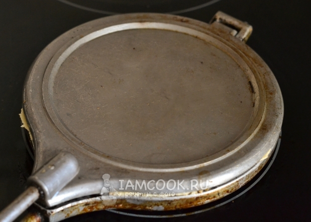 Вставляем вторую часть формы в зазор. Соединяем ручки. Лишнее тесто, которое так и норовит выскочить из формочек, сразу удаляем ножом. Форму располагаем на жарочной поверхности. Замечу, что наши мамы пекли орешки на газу или на электроплитке с малыми конфорками. Орешница идеально подходила для них. Я готовлю на металлокерамике, и у меня очень даже всё неплохо получается.