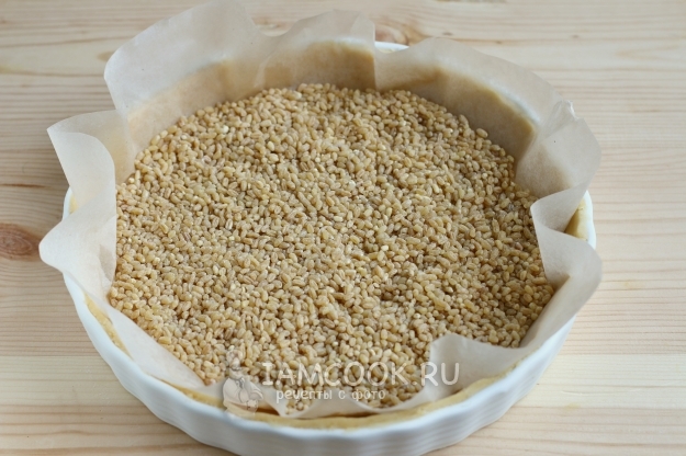 После достанем форму с тестом, уложим на тесто пергамент и насыплем любую крупу, у меня - рис. Это нужно для того, чтобы во время выпечки тесто не вздувалось. Печем тесто с рисом около 10 минут, затем уберем бумагу с рисом и допечем еще 5-7 минут.