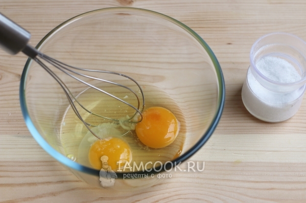 Отставим пока форму с тестом и сделаем начинку. Два яйца, белок и щепотку соли разбиваем венчиком.