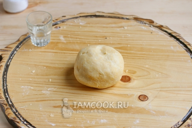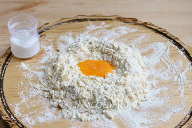 После добавляем в массу из масла и муки один куриный желток, а белок от яйца пойдет с остальными яйцами в начинку. Также добавим щепотку соли и быстро все смешаем, собирая тесто в шар.