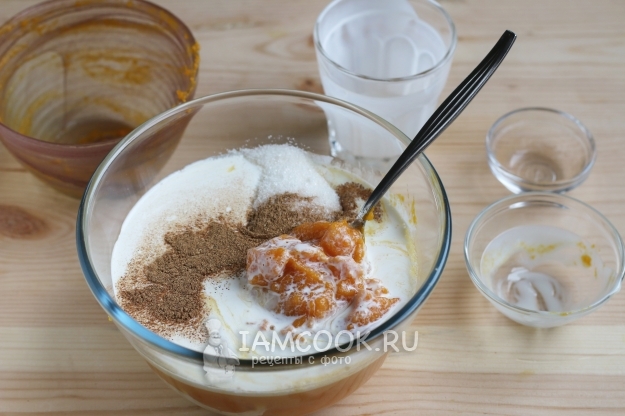 Добавляем тыквенное пюре, сливки, сгущенное молоко и корицу, смешиваем до однородной массы.