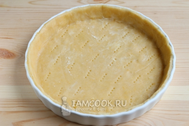 Форму для выпечки смазывать маслом не надо, ведь масло есть в самом тесте и готовый пирог прекрасно выйдет из формы. Раскатываем тесто и укладываем его в форму, прижимая бортики, лишнее тесто срежем. Накалываем вилкой тесто в разных местах, чтобы во время выпечки оно не вздулось. Форму с тестом поставим еще на 10 минут в холодильник, а в это время разогреем духовку до 190-200 градусов.