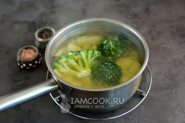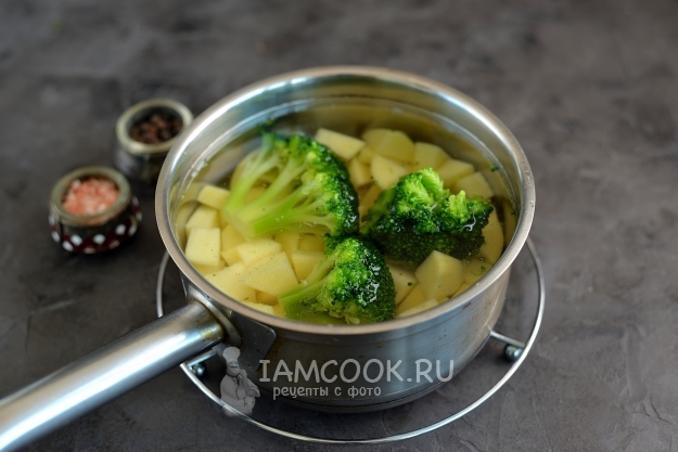 Воду посолите по вкусу, поставьте овощи вариться. Как только вода закипит, установите таймер на 4 минуты, наша задача - сохранить все полезные вещества капусты. После сигнала выловите брокколи из кастрюли, а картофель продолжайте варить до готовности, это максимум 15 минут.