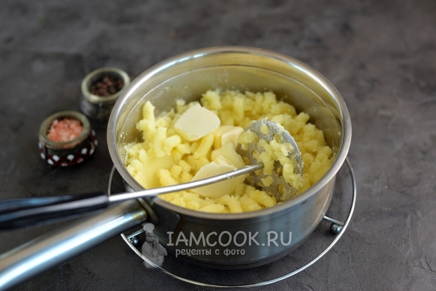 Слейте воду, с помощью мялки для картофельного пюре протрите картошку до однородного состояния. Добавьте масло, еще раз протрите мялкой пюре. Теперь по чуть-чуть добавляйте теплое молоко, регулируйте густоту по своему вкусу. В моей семье любят густое.