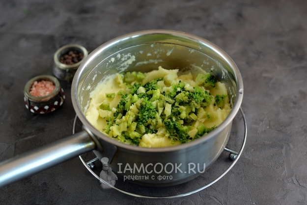 Теперь очень мелко порубите брокколи ножом, добавьте ее в картофельное пюре, при желании поперчите. Еще раз все хорошенько перемешайте.