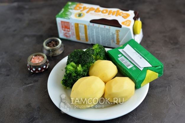 Продукты для приготовления пюре из картошки и брокколи подготовьте по списку ингредиентов. Картофель почистите, помойте. Если соцветия брокколи замороженные, постарайтесь разморозить их заблаговременно.