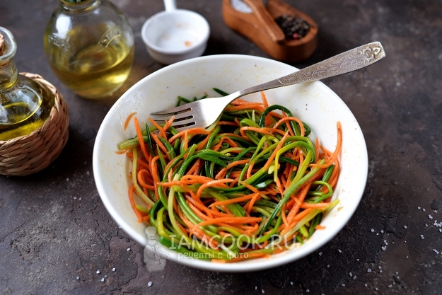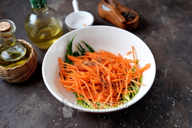 Откиньте черемшу на дуршлаг, при необходимости можно даже слегка отжать лишнюю воду. Положите к ней натертую соломкой морковь. Всыпьте приправу для корейской моркови, добавьте соль и перец по вкусу, при желании можно всыпать сахар.