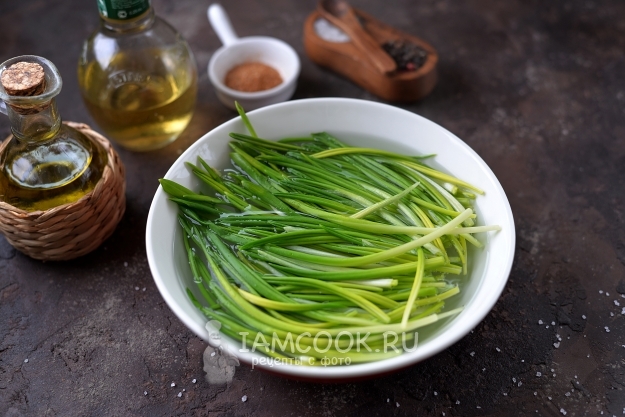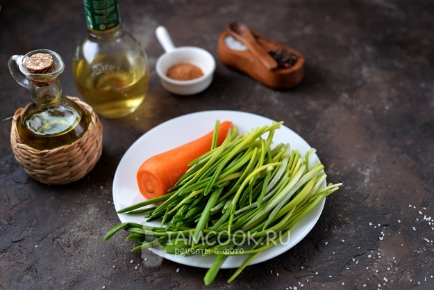 Подготовьте продукты по списку. Морковь почистите, помойте вместе с черемшой под проточной водой.