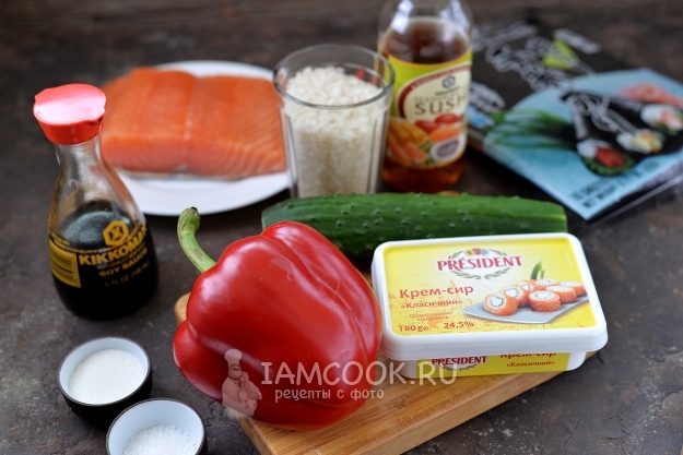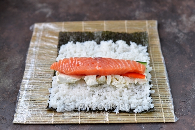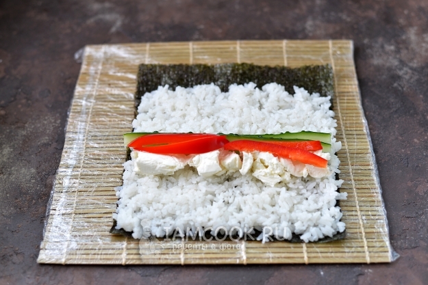 На циновку положите целый лист нори, на него мокрой ложкой выложите готовый рис (где-то 4-5 ст.л.). Посередине положите сыр "Филадельфия", нарезанный тонкой соломкой свежий огурец и очищенный от семечек болгарский перец.