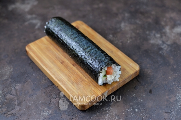С помощью циновки сверните нори в рулет, положите швом вниз, дайте пару минут постоять, чтобы шов склеился.