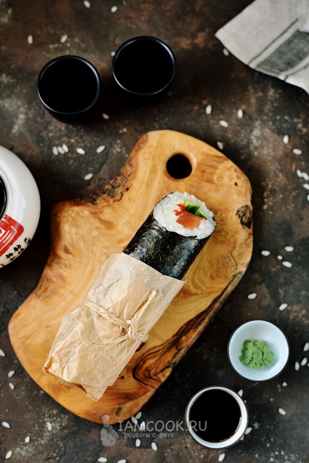 В одно время я с удовольствием смотрела передачу Эндрю Циммерна "Необычная еда". В ней он ездил по разным штатам, а потом и странам, показывал и рассказывал про интересную еду разных народов. В одной из серий я и увидела буррито-суши, которые он покупал в фудтраках, стоящих на улицах и в городских парках. Идея мне жутко понравилась, очень удобно, если не сильно хочется играться с роллами и нет навыка поедания суши палочками хаши.