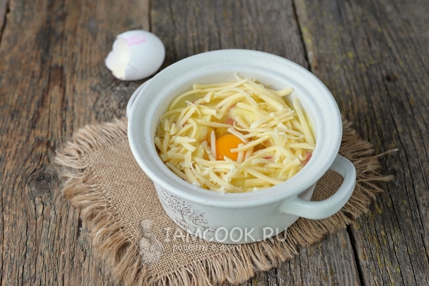 Посыпьте блюдо сверху натертым твердым сыром, отправьте в разогретую до 200 градусов духовку на 15-20 минут. Белок должен приготовиться, а желток - остаться сырым.