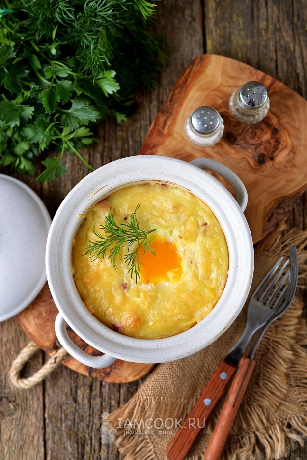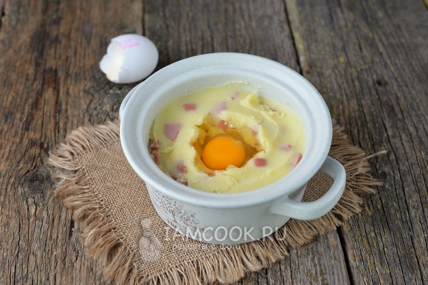 Переложите пюре, смешанное с сосиской, в порционную форму для запекания. В середине сделайте углубление, вбейте сырое яйцо.
