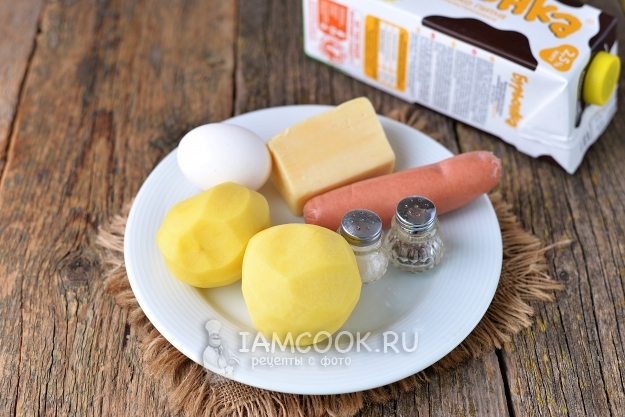Продукты для приготовления запеканки из картофельного пюре в духовке подготовьте по списку ингредиентов. В нашем случае картофельное пюре придется приготовить. Так что почистите картофель, помойте его под проточной водой.