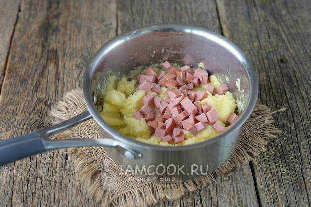 Слейте воду с картофеля, добавьте немного молока, черного молотого перца для аромата, протрите в пюре. Сосиску нарежьте мелким кубиком, всыпьте в пюре, перемешайте.