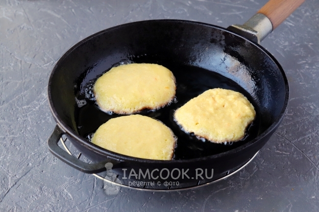 Тем временем отправить сковороду с растительным маслом на плиту и хорошо нагреть. Смоченными в холодной воде ладонями или просто столовой ложкой сформировать из теста заготовки и выложить их на сковороду. Жарить на среднем нагреве без крышки около 1,5-2 минут с обеих сторон, до красивого золотистого цвета.